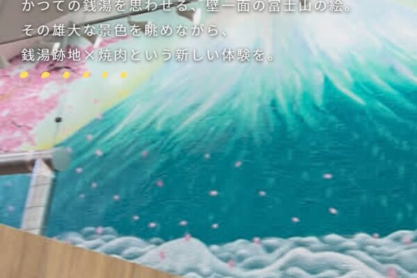 🗻懐かしさとモダンが交わる、心地よいひとときを。 泉佐野「日の出湯」の記憶を受け継ぐ空間で、 壁一面に描かれた富士山を眺めながら焼肉を楽しむ。 銭湯跡地×焼肉という、ここでしか味わえない新しい体験を。…